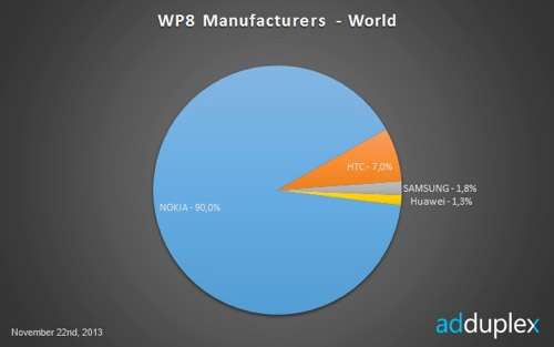 Основным поставщиком WP-смартфонов по-прежнему остается компания Nokia, на долю которой приходится 90% всех устройств. Второе место удерживает тайваньская компания HTC с долей в 7%, далее следуют Samsung и Huawei – 1,8% и 1,3% соответственно.