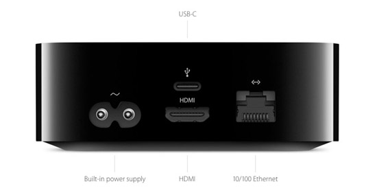 Apple TV четвертого поколения продается в двух модификация — с 32 или 64 ГБ флеш-памяти. В отличие от большинства конкурентов у «яблочного» продукта отсутствует слот для карты памяти, а к USB-порту нельзя подсоединять внешний накопитель. Этот интерфейс предназначен для восстановления прошивки.