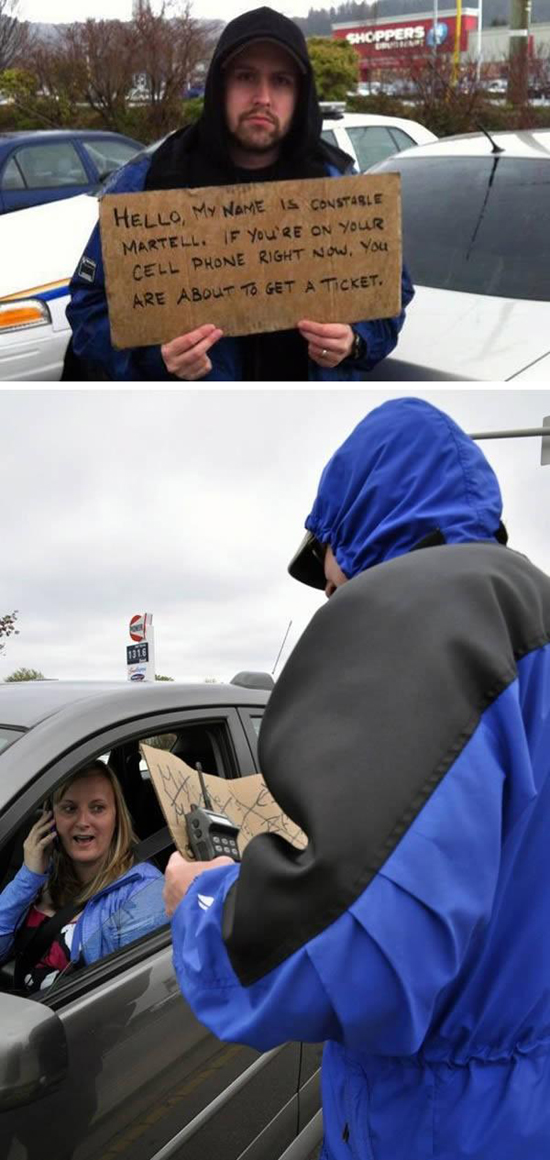 Бродя среди остановившихся на перекрестке машин, он нес картонную табличку, на которой было написано: «Привет, меня зовут констебль Мартелл. Если вы сейчас пользуетесь мобильным телефоном, то получите штраф».