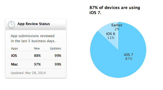Apple обновила раздел сайта App Store Distribution, отражающего статистику использования различных версий iOS в процентном выражении на «яблочных» гаджетах. По данным компании, девять из десяти владельцев iPhone, iPad и iPod touch благополучно обновились на операционную систему iOS 7.