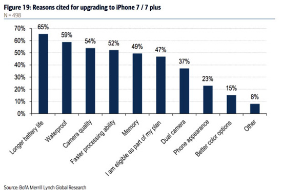 Аналитики Bank of America провели исследование о причинах, по которым пользователи обновляются на смартфоны iPhone 7. Примечательно, что возможности камеры «яблочных» новинок оказались по популярности лишь на третьем месте.