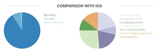 Последняя версия операционной системы iOS 7 занимает долю 91%, iOS 6 — 8%, а более старые версии в общей сложности установлены только на 1% всех устройств. В случае с Android диаграмма выглядит совсем иначе и невозможно выделить одну версию, идущую с существенным отрывом от остальных. Наиболее популярные версии Android 4.1 и Android 4.4 установлены на 26,5% и 20,9% устройств соответственно, и еще четыре версии также занимают существенную долю на рынке.