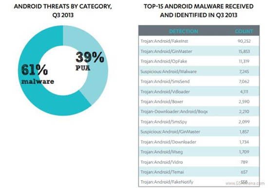 В третьем квартале 2013 во всей мобильной среде было зарегистрировано 259 типов угроз, и 252 из них оказались на Android, а 7 - на Symbian OS. На iOS, BlackBerry OS и Windows Phone вредоносного ПО обнаружено не было.
