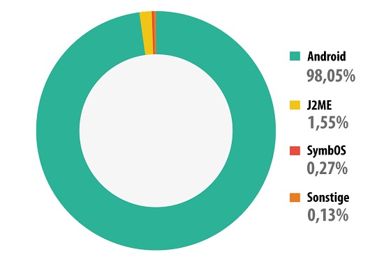 Как ни печально, но Android остается номером 1 среди всех операционных систем, наиболее привлекательных для атаки со стороны известных вредоносных программ, тогда как о BlackBerry или iOS в отчете даже не упоминается. Вместо этого, в сообщении присутствуют J2ME, SymbOS и Sonstige, на которые и пришлись оставшиеся 2%.