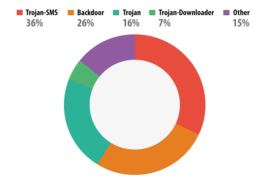 В списке же самих программ лидируют SMS-трояны (36%), следом идут бэкдоры (26%) и обычный троян (16%). Учитывая, что большинство сегодняшних SMS-троянов, за некоторыми исключениями, переквалифицировались в ботов, два первых места могут быть легко объединены в одну категорию: бэкдор программы. Это означает, что 62% вредоносного ПО включает в себя элементы мобильных ботнетов.