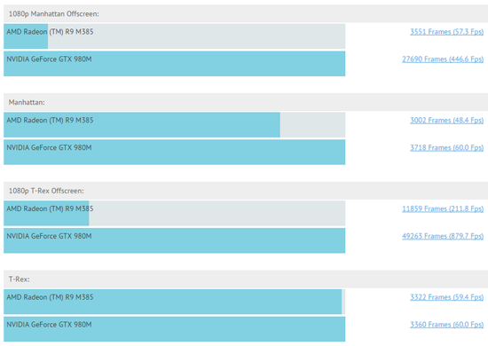Advanced Micro Devices готовит к выпуску не только линейку дискретных графических решений для рынка настольных ПК, но и мобильные версии «трёхсотой» серии Radeon. Флагманом, предположительно, станет Radeon R9 M385. Он получит новое кодовое имя, но при этом будет представлять собой переименованное ядро Tonga. Данные по этому решению засветились на сайте GFXBench, и мы решили использовать движок сайта, чтобы сравнить результаты Radeon R9 M385 и GeForce GTX 980M.
