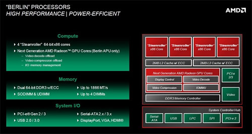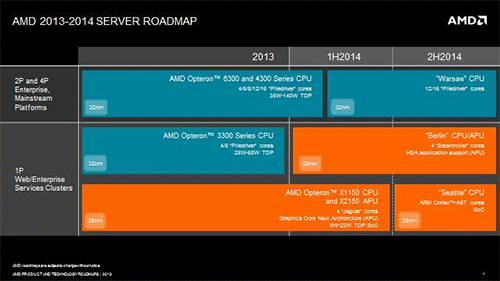 Также AMD сообщила о том, что во второй половине 2014 года в продажу поступят традиционные серверные процессоры Berlin (архитектура Steamroller), которые будут представлены как со встроенной графической подсистемой так и без нее. Данные решения смогут похвастаться поддержкой архитектуры памяти HSA. А в первом квартале 2014 года стоит ожидать появления 12- и 16-ядерных процессоров Warsaw (архитектура Piledriver), которые будут использоваться в серверных системах с 2 или 4 процессорными разъемами.