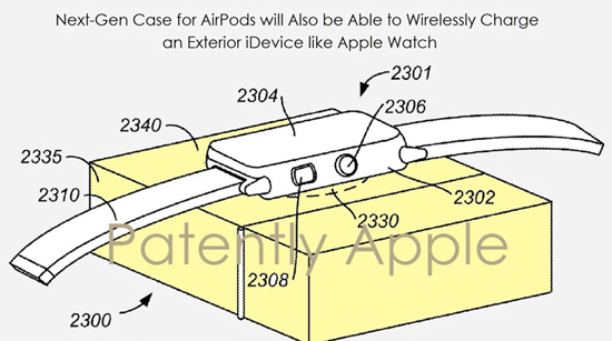 По замыслу разработчиков Apple, чехол для AirPods 2 будет выступать в качестве внешнего аккумулятора для самых разных продуктов, включая Apple Watch, iPhone, iPad и даже MacBook. На иллюстрации к патенту показана модель кейса со встроенной индуктивной площадкой, на которой находятся «умные» часы.