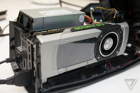 Тем не менее, решение Alienware также заслуживает внимания. Так называемый «графический усилитель (Graphics Amplifier) был представлен компанией одновременно с выпуском нового игрового ноутбука Alienware 13. Стоит он 300 долларов США и представляет собой сравнительно небольшой прямоугольный корпус со светящимся логотипом Alienware на передней панели. Внутри расположен отдельный блок питания мощностью 350 ватт, чего достаточно для подавляющего большинства современных графических карт, а также необходимая логика, обеспечивающая сопряжение и функционирование полноразмерного слота PCI Express x16 (электрически x4). Устройство обладает широкой совместимостью, исключение составляют лишь карты с трёхслотовой системой охлаждения или двухчиповые модели, такие как Radeon R9 295X2 — они не поддерживаются.