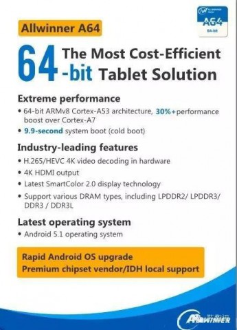 В течение всего года компания Allwinner вела скрупулезную работу, представляя новые процессоры, способные обеспечить высокую производительность за невысокую цену. И массовое производство новой линейки чипов A64 для планшетных компьютеров Allwinner A64, которая, по заявлению компании, соответствует обоим критериям, начнётся уже в ближайшее время. Линейка A64 обладает большим количеством преимуществ, среди которых 64-битная архитектура, использование мощных, но экономичных ядер A53, а также ряд других возможностей, которые совсем не ожидаешь встретить у чипсета стоимостью всего $5.