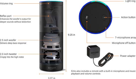 Echo был представлен в ноябре прошлого года и имеет все шансы стать ещё одним бестселлером Amazon. Устройство получило два излучателя: широкополосный и низкочастотный с акустическим оформлением в виде фазоинвертора, а также оборудовано массивом из 7 микрофонов. Автономного питания колонка не имеет и работает от сети. Управляющая платформа основана на системе Texas Instruments с 256 Мбайт оперативной и 4 Гбайт постоянной памяти, имеются модули связи Wi-Fi и Bluetooth.