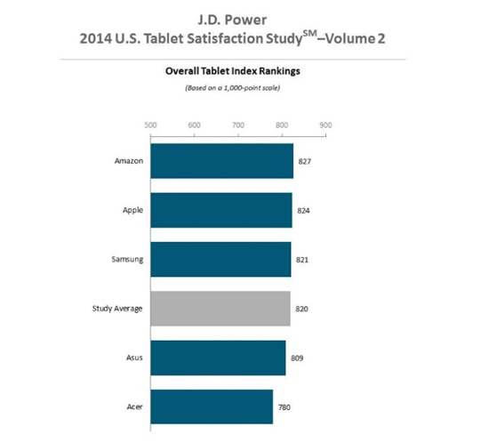 Согласно недавнему исследованию J.D. Power «2014 U.S. Tablet Satisfaction Study—Volume 2», интернет-компания Amazon впервые опередила Apple в рейтинге по степени удовлетворенности планшетом среди пользователей США.