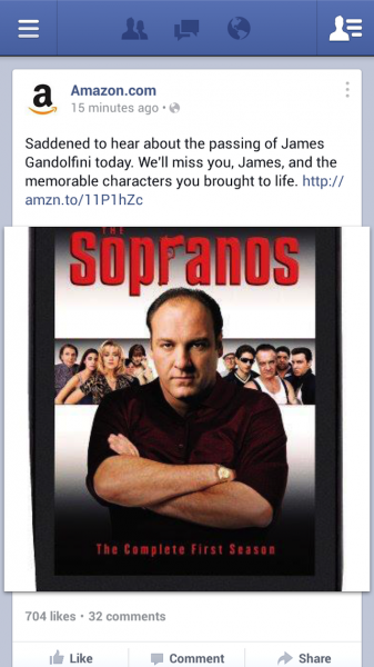 Чем Amazon прогневала интернет? В сообщении о гибели актера она привела в самом конце ссылку на диски со всеми сезонами «Сопрано». Отличный маркетинговый ход, ничего не скажешь. Не исключено, конечно, что кто-то в компании просто недосмотрел за излишне инициативными сотрудниками, которые следят за размещением в соцсетях. В любом случае, Amazon после бурной критики в свой адрес быстро удалила ссылку. Это, конечно, хорошо, но осадок остался.