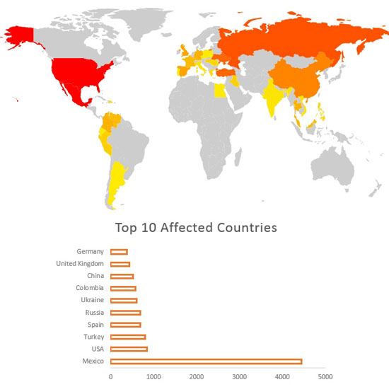 Страны, в которых было приобретено наибольшее количество заражённых планшетов