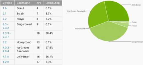 Количество устройств, использующих Android 4.1 или 4.2, выросло до 28,4%, и этого хватило, чтобы обойти, наконец, версию Ice Cream Sandwich, доля которой оказалась на уровне 27,5%. Прирост состоялся как за счет тех, кто обновился с ICS, так и за счет тех, кто перешел с более ранних версий Android вроде невероятно популярной (несмотря на свой преклонный возраст) Gingerbread (2.3).