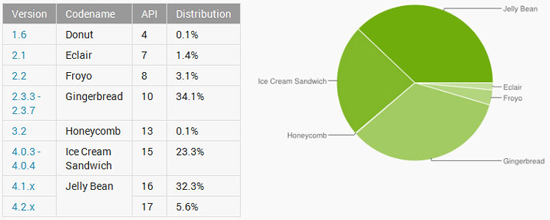 Компания Google опубликовала новые данные о популярности разных версий операционной системы Android. Согласно полученным данным, Android Jelly Bean теперь лидирует с показателем 37,9% (на долю Android 4.1.x приходится 32,3%, 4.2.x — 5,6%). Вторая позиция принадлежит Android Gingerbread (34,1%), третья — Android Ice Cream Sandwich (23,3%).