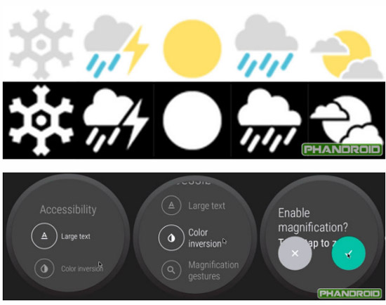 Разработчики добавили в Android Wear Lollipop некоторые специальные настройки, включая инверсию цветов, более крупные шрифты. Появились новые настройки яркости. Достаточно сделать свайп вниз, чтобы открылось меню, из которого следует выбрать режим кинотеатра (подсветка отключается полностью до момента нажатия кнопки включения), режим максимальной яркости, режим тишины и настройки.