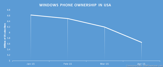 С начала 2015 года пользователей WP-смартфонов в США стало меньше почти на миллион. По состоянию на апрель доля этой мобильной ОС составляла 3,0%, тогда как еще в январе этот показатель оценивался в 3,6%. Потерянные за этот период 0,6% означают то, что около 966 000 пользователей перебрались на другие платформы. Данный спад наметился в Штатах достаточно давно, но с течением времени он становится все более резким.