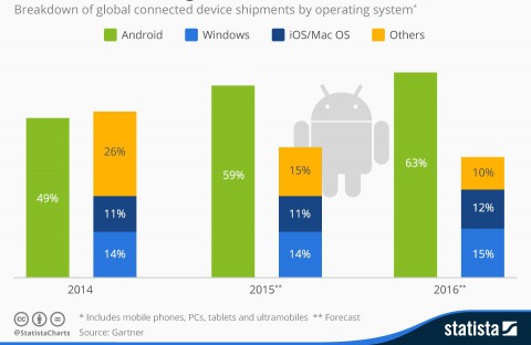 В 2014 году поставки устройств на операционной системе Android превзошли 1 миллиард устройств, а в 2015 году этот показатель вырастет на 26%. Как сообщает компания, Android останется доминирующей платформой в ближайшие 2 года.