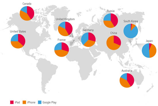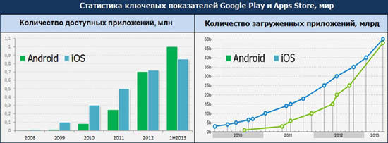 200 самых популярных iOS-программ ежедневно приносят около $18 млн против приблизительно $15 млн годом ранее. Для сравнения: доход от продаж 200 самых востребованных Android-приложений за 12 месяцев подскочил с $3,5 до $12 млн, то есть в три с лишним раза. Аналитики связывают это с тем, что Google взяла иной подход, чем некогда компания Apple: любой производитель оборудования может использовать операционную систему Android на своих устройствах. В результате сейчас на рынке представлено огромное количество Android-гаджетов, в том числе бюджетных, актуальных для сегмента менее платёжеспособных потребителей.