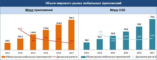 По оценкам Gartner, в 2017 году будет суммарно загружено около 269 млрд приложений, выручка составит $76,5 млрд.