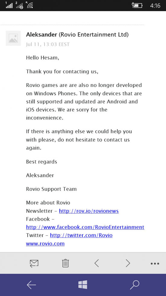 Подобный шаг был в целом ожидаем — ещё в 2015 году Rovio приняла решение не выпускать Angry Birds 2 в версии для Windows Phone. В email-сообщении представители поддержки Rovio ответили WP-пользователям, что не стоит ждать обновлений Angry Birds. Более того, компания собирается выпускать новые игры и обновления всех своих проектов только для Android-аппаратов и iOS-устройств.
