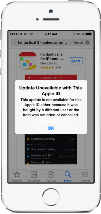 При попытке установить апдейт для приложения, за которое Apple вернула деньги, App Store теперь показывает сообщение следующего вида: «Обновление не доступно для этого Apple ID по причине того, что приложение могло быть куплено другим пользователем или вы возвратили деньги за приложение или отменили покупку».