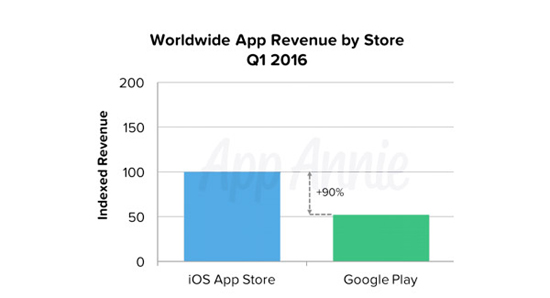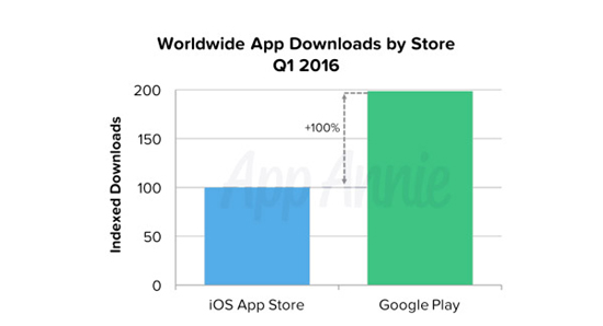 В I квартале 2016 года из магазина Google Play было скачано в два раза больше приложений, чем из App Store. При этом магазин Apple сохранил лидерство по уровню доходов — с января по март App Store на приложениях заработал в два раза больше, чем Google Play.