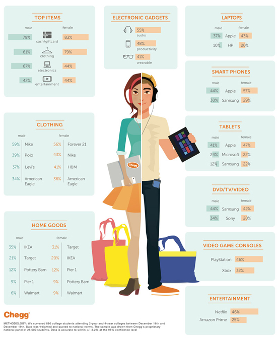 В категории ноутбуков бренд Apple предпочитают 37% мужчин и 43% женщин. На втором месте по популярности HP, которую поддержали 10% мужчин и 20% женщин. В категории наушников наиболее предпочитаемым брендом Beats считают 46% респондентов, в том числе 33% мужчин и 55% женщин. На втором месте бренд Bose, за который высказалось 24% опрошенных студентов.