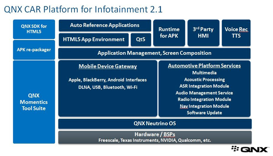 Для крупнейших корпораций, вроде Apple и Google, занимаемая компанией BlackBerry ниша на рынке смартфонов и планшетов не сможет представлять даже минимальную конкуренцию. Однако в то же время многие автомобильные концерны зависят напрямую именно от разработок подразделения QNX Software Systems, которым владеет BlackBerry. Генеральный директор BlackBerry Джон Чен (John Chen) называет микроядерную операционную систему QNX, предназначенную для использования преимущественно в автомобильной индустрии, самым настоящим бриллиантом канадской компании. Несмотря на тяжелую финансовую ситуацию самой Blackberry, что нашло отражение в резком сокращении объёмов производства мобильных устройств и даже слухах об отказе от данного рынка, инвестиции в QNX планируют только увеличиваться. Этот факт привлекает внимание сторонних производителей, выступающих с предложениями о взаимовыгодном и прибыльном сотрудничестве.