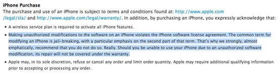 «Внесение неавторизованных модификаций в программное обеспечение iPhone является нарушением лицензионного соглашения по использованию программного обеспечения. Общий термин для модификаций iPhone, джейлбрейк, конкретно, нарушает второй пункт правил. Вот почему мы настоятельно рекомендуем, буквально настаиваем, чтобы вы не делали этого. Правда. Если в результате внесения неавторизованных модификаций в ПО устройство потеряет работоспособность, ремонт такого устройства не будет покрываться гарантией».