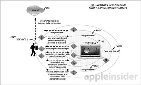 Изучение патентных заявок принесло информацию о подаче компанией Apple на регистрацию документа с названием «Network access using short-range connectability». Этот документ подан на регистрацию 1 мая 2012 года и уже близок к утверждению. Согласно предложению Apple, персональные устройства типа смартфонов и другой мобильной электроники могут иметь сотовые модемы для работы с Интернет, но в случае обнаружения в зоне досягаемости сети, как они выражаются «low-power communications», устройства автоматически входят в сеть с «низким потреблением» и работают с сервисами глобальной сети как обычно. В качестве примера LPC-сетей в патенте приводится стандарт Bluetooth, что отсылает нас на 11 лет назад.
