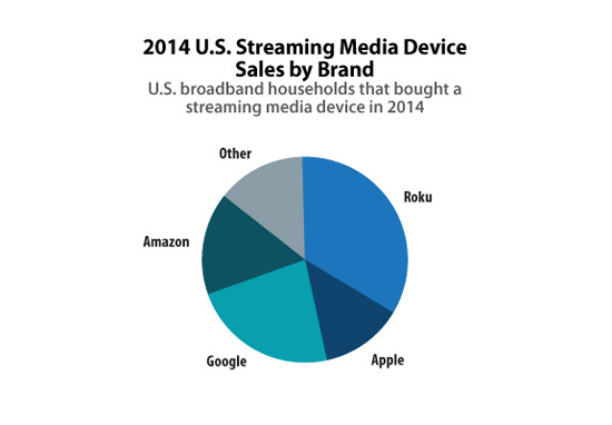 Согласно результатам исследования, лидером американского рынка ныне является Roku, ее доля за год выросла на 5 процентных пунктов – до 34%. На втором месте Google Chromecast с результатом 23%. При помощи гугловского устройства можно смотреть видео, слушать музыку и просматривать интернет-сайты на большом экране телевизора. Гаджет стоит вдвое дешевле «яблочного» конкурента. На третьем месте по популярности – Amazon Fire TV.