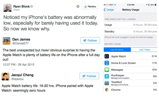 Пользователи массово жалуются в Твиттере на повышенное энергопотребление смартфона в связке с часами — а поскольку без активного соединения с iPhone Watch не будут полноценно функционировать, этот недуг становится серьезным аргументом против приобретения. Возможно, это расплата за компенсацию времени, которое вы экономите с аксессуаром вместо того, чтобы доставать любимое средство связи из кармана?