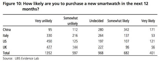 В опросе UBS приняли участие 4 000 человек из четырех разных стран -Великобритании, Италии, Китая, и США. 10% респондентов признались, что «вероятнее всего» купят смарт-часы в следующем году. Основываясь на данных о продажах Apple iPhone и числе iPhone, совместимых с Watch (напомним, это iPhone 5 и более новые устройства — прим.ред.), эксперты UBS делают вывод: