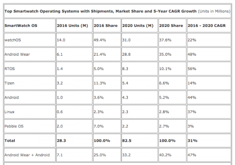 Второй по популярности операционной системой для "умных" часов, по прогнозам IDC, будет оставаться Android Wear. К 2020 году доля рынка этой ОС вырастет до 35%, а продажи часов под её управлением - до 28,8 миллиона единиц. Тройку лидеров к 2020 году замкнут смарт-часы от китайских производителей на так называемых операционных системах реального времени (RTOS).