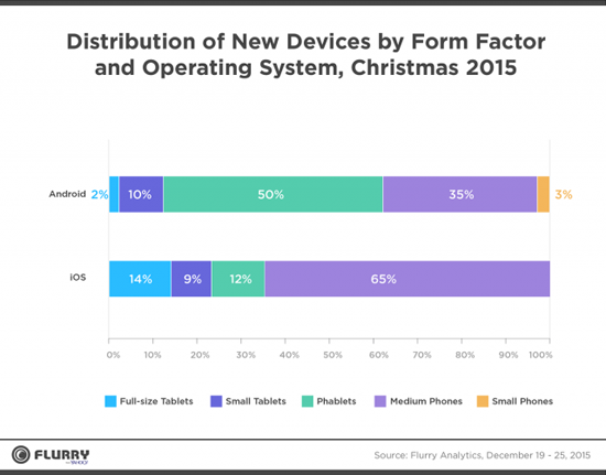 Аналитики Flurry отмечают возросшую популярность фаблетов. Так, если в 2013 году на их долю приходилось лишь 4% активаций в рождественские праздники, в 2014 году – 13%, то на этот раз они обеспечили 27% всех активаций. Небольшие смартфоны с диагональю 3,5 дюйма и меньше выступили в качестве рождественского подарка в 1% случаев. Продолжает падать доля смартфонов средних размеров: в 2013 году она составляла 64%, в 2014 снизилась до 63%, а в 2015 году резко упала до 54%.