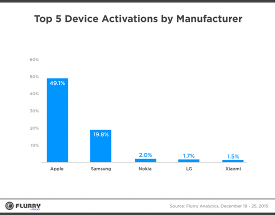 Flurry изучила количество активаций новых устройств и загрузки приложений в период с 19 по 25 декабря. По результатам исследования, 49,1% всех активированных в это время новых гаджетов были выпущены именно компанией из Купертино. Данный результат оказался чуть хуже прошлогоднего – в 2014 году доля Apple составляла 51,3%.