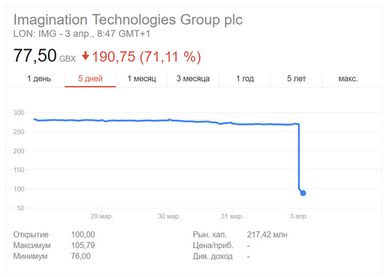 Новость стала большим ударом для бизнеса британской компании. После этого заявления капитализация Imagination Technologies упала более чем на 70%, поставки которой производителю iPhone составляют половину прибыли. Apple также владеет 8% акций поставщика. Год назад «яблочная» компания хотела купить Imagination Technologies, но отказалась от этой идеи.