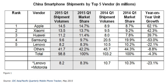 Как мы уже писали ранее, в начале года Apple стала основным поставщиком на китайском рынке - на её долю пришлось 14,7% новых устройств или 14,5 миллионов смартфонов. По сравнению с предыдущим годом рост поставок составил 62%. По этому показателю Apple обогнала даже Xiaomi, которой по итогам отчётного периода принадлежит 13,7% рынка.