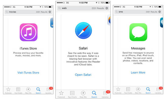 App Store остается несомненным лидером в сравнении с Google Play по соотношению полезных и актуальных приложений к многочисленным клонам и некачественным решениям. Однако Apple этого оказалось недостаточно, и теперь при вводе в поиск App Store таких ключевых слов, как web, SMS, movies и некоторых других первыми предложениями отображаются стандартные приложения iOS 7.