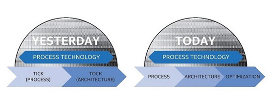 Отход от схемы «Тик-так» произойдёт уже в этом году, когда чипы Kaby Lake станут третьими процессорами компании на 14-нм транзисторах, после Broadwell и Skylake. Связано это со сложностями освоения более тонких техпроцессов, ведь по старой схеме производства, в этом году должны были бы появится 10-нм процессоры. В дальнейшем Intel также планирует выпускать как минимум по три поколения процессоров. Новая схема называется Процесс, Архитектура, Оптимизация (Process, Architecture, Optimization), или как её прозвали западные СМИ – «Тик-так-так».