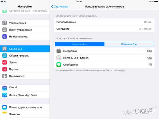 Использовать новую возможность iOS 8 довольно просто. Переходим в меню «Основные –> Статистика –> Использование аккумулятора». Здесь находится два подраздела – «После последней полной зарядки» и «Использование аккумулятора». В первом указано общее время работы устройства в активном режиме и в режиме ожидания. Второй разбит на два подраздела «Последние 24 часа» и «Последние 7 дней».