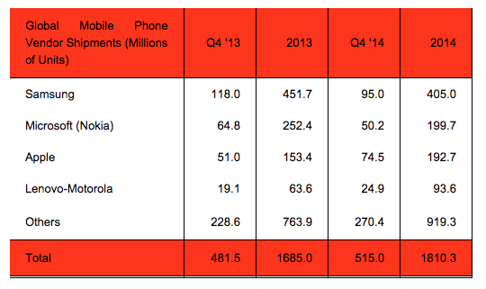 Продажи всех мобильных телефонов в прошлом году выросли на 7% — до рекордных 1,8 млрд штук. Лидером рынка осталась Samsung — ее доля составила 22,4%, второе место заняла Microsoft, купившая мобильный бизнес Nokia, с долей в 11%, третье место — Apple с долей рынка в 10,6%.