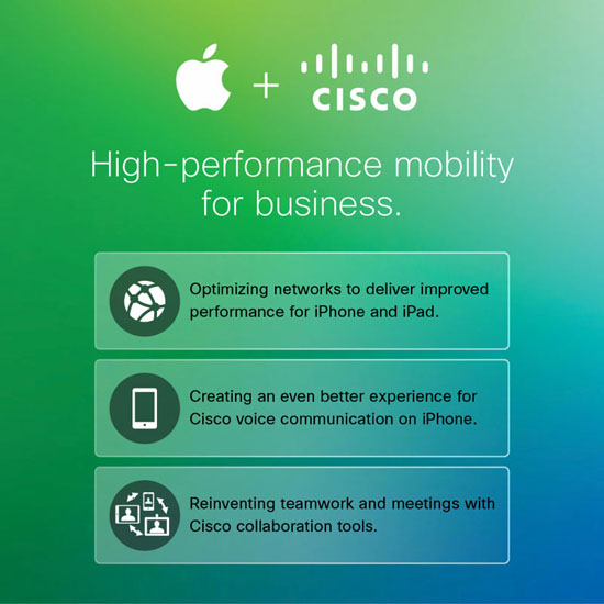 В рамках сотрудничества компании планируют оптимизировать сети Cisco и iOS-устройства для их более эффективной и надежной совместной работы с целью предоставления пользователям более высокой производительности в свете роста спроса в области корпоративной инфраструктуры.