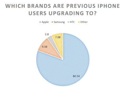 Как уже было сказано ранее, владельцы смартфонов Apple крайне лояльны к этому бренду и редко меняют его на устройства от других производителей. Так, лишь 20% бывших владельцев iPhone сменили его на другие телефоны, из которых 9,58% перешли на Samsung, 2,8% - на HTC, а 7% разделились между другими брендами.