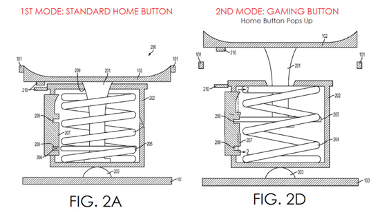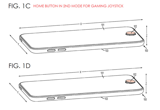 В новой патентной заявке Apple описывает конструкцию джойстика для iPhone и iPad, встроенного непосредственно в кнопку Home. В стандартном режиме клавиша используется для обычных задач: возвращения на главный экран и запуска панели многозадачности. Нажав на кнопку с небольшим усилием, пользователь активирует «игровой» режим: кнопка слегка приподнимается над поверхностью экрана и работает, как тензометрический джойстик.