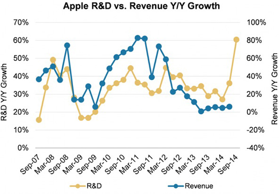 График изменения затрат на НИOКР (R&D) относительно выручки Apple