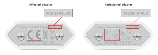 Дефектные адаптеры имеют маркировку A1300, а буквы CE на нем сплошного серого цвета. Нормальные адаптеры подставляются как модель A1400 с буквами CE, имеющими серый контур. До замены Apple призывает не пользоваться опасным модулем и заряжать телефон от компьютера. Обменять адаптер можно в авторизованном сервисном центре.