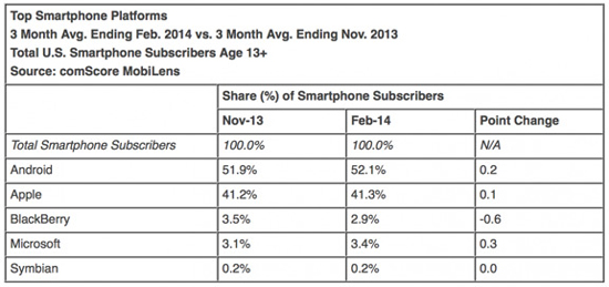 Доля Android в первом квартале в США выросла на 0,2%, iOS набрала 0,1%, добившись рыночной доли в 41,3%. Канадский производитель смартфонов BlackBerry потерял за три месяца 0,6% и остановился на уровне 2,9%, тогда как доля Microsoft-ОС увеличилась на 0,3 процентных пункта до 3,4%.
